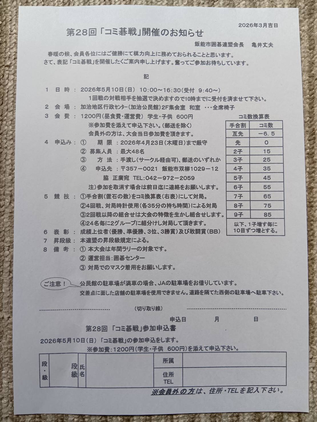 ◎ 2026年5月10日(日) 第28回「コミ碁戦」 (置石をコミで換算するハンデ戦)が開催されます。