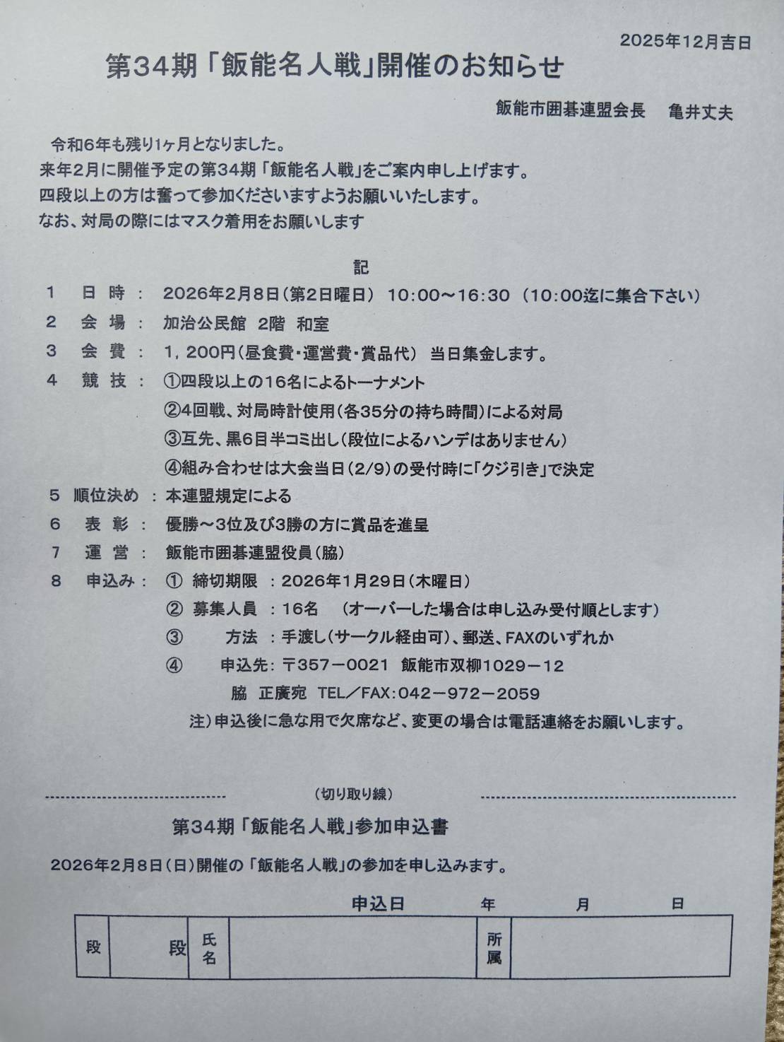 ◎ 2026年2月8日(日) 第34期「飯能名人戦」が開催されます。
