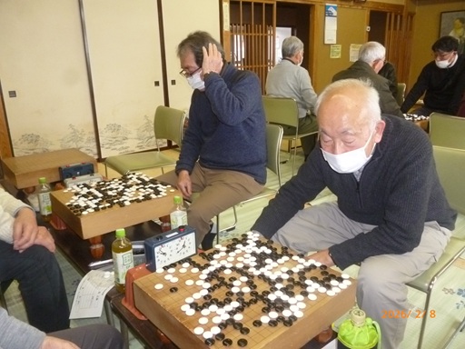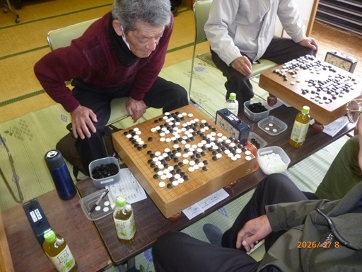 今回のAクラスの決勝戦は、3回戦で昨年この大会で優勝した内田さんを破った小林さんと、同じく3回戦で飯能名誉名人の森長さんを破った亀井会長で行われ、小林さんが中押し勝ちしました。